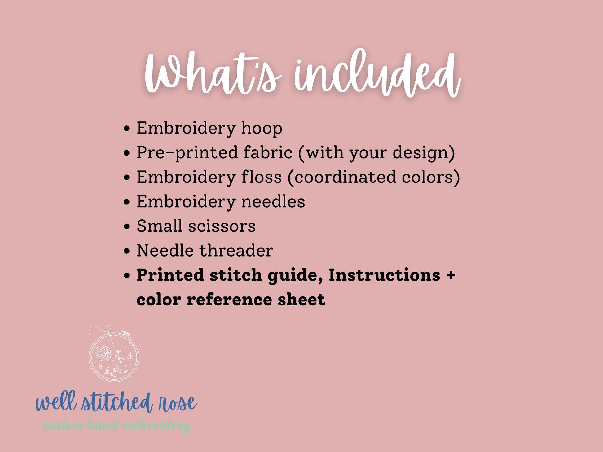 - Premium DMC embroidery floss (limited, coordinated palette)